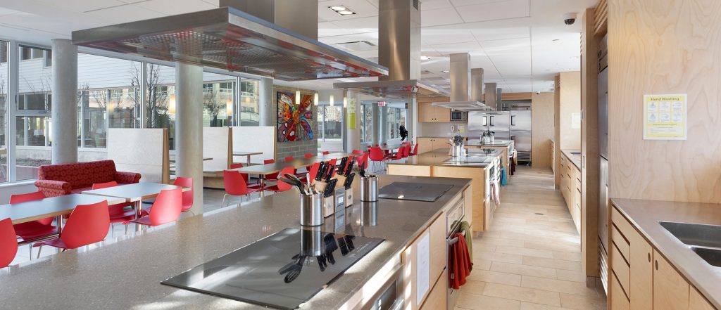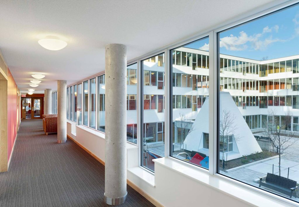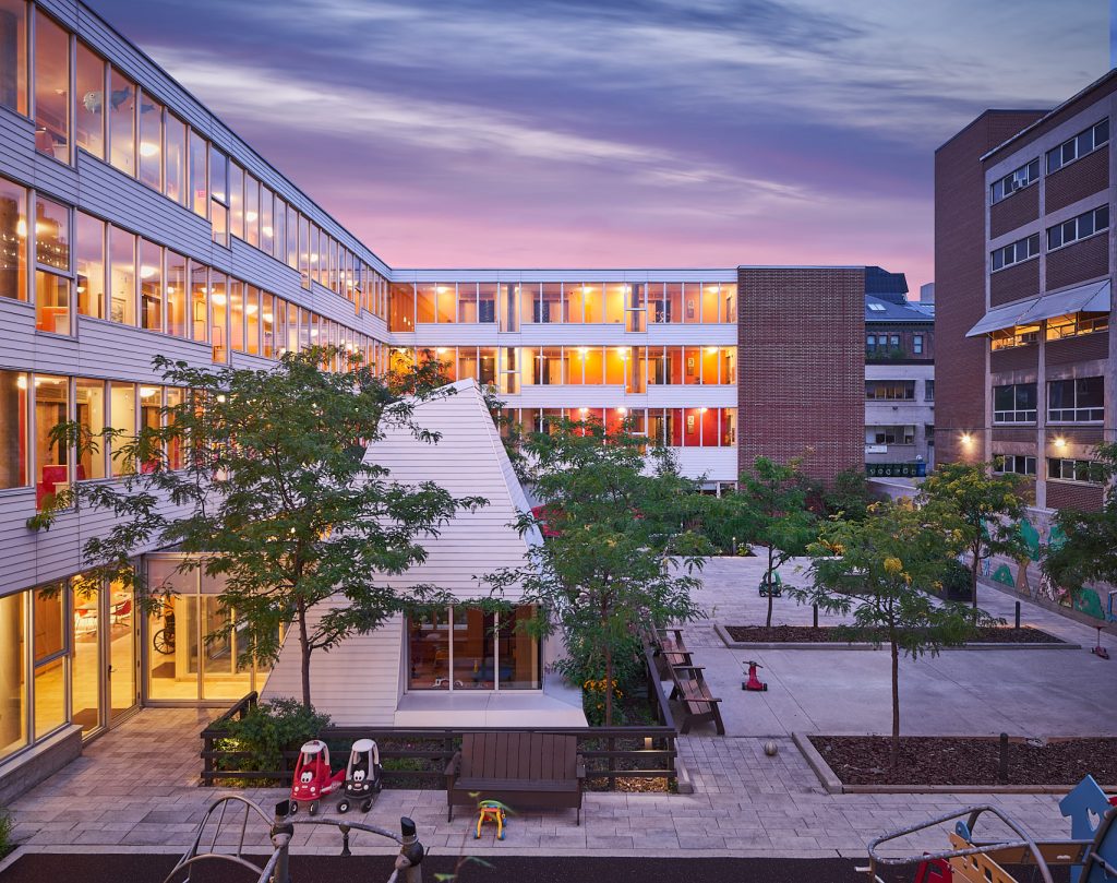 Notwithstanding the special needs of the children, the new House is designed to encourage a sense of normalcy for the children and their families and to provide an environment where “kids can be kids” to the fullest extent possible. Creating a refuge from the hospital and the city was imperative to the design vision. The scale, cadence and material palette of the house were judiciously selected to complement the Victorian character of the surrounding residential neighbourhood. This modest expression is paired with a highly potent plan. Within the constraints of a tight urban site, the design creates a series of impressive courtyards, each with its own function, to address the street frontages and achieve a sanctuary within the city. Connections with nature, privileged across each of the four levels, yield a true counterpoint to hospital and city. On the ground floor, the school, living room, dining area all offer walk-outs to a courtyard. Above, hallways, lobbies, suites, and social areas benefit from a positive orientation and shallow floor plate, offering ready access to daylight, through ventilation and engaging views outdoors.